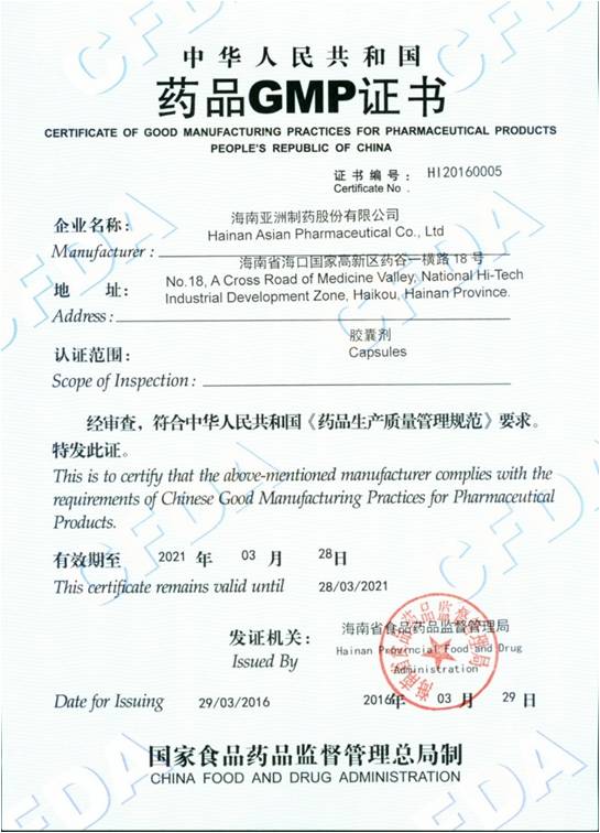 海南亚洲制药股份有限公司(药谷新厂和金盘厂区)通过国家GMP认证。